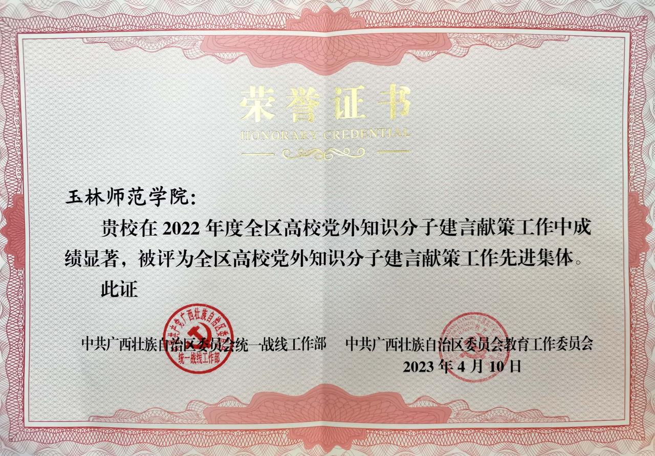 4月26日,全区党外知识分子工作推进会暨高校党外知识分子建言献策经验交流会在南宁举行。会议对被评选为2022年度全区高校党外知识分子建言献策工作先进集体的16所高校、先进个人的23名同志进行表彰。其中,我校被评为2022年度全区高校党外知识分子建言献策工作先进集体,我校党外知识分子徐文永同志被评为2022年度全区高校党外知识分子建言献策工作先进个人。