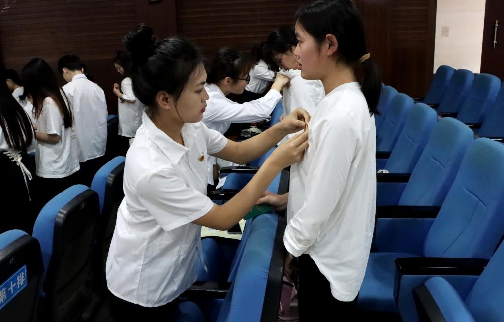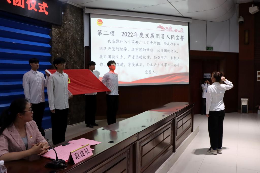 大会为2022年度新团员举行入团仪式,与会领导为新团员代表颁发团员证,2022年度十佳共青团员、红旗团支部团支书、感动校园人物、青春榜样人物为其他新团员佩戴团徽、颁发团员证。随后,2022年度新团员进行入团宣誓,全体成员共唱中国共产主义青年团团歌。