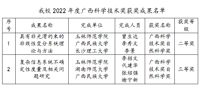 会议表彰了获得2022年度广西科学技术奖励的科技人员。我校共获得2022年度广西科学技术奖2项。其中,数学与统计学院曾生达博士主持完成的“具有非光滑约束的非线性变分系统理论与方法”获得自然科学二等奖,这是我校首次以第一完成单位获得广西科学技术二等奖,是我校在科学技术高级别奖项上历史性突破;数学与统计学院李招文教授主持完成的“复杂信息系统不确定性度量及相关问题研究”获得自然科学三等奖。