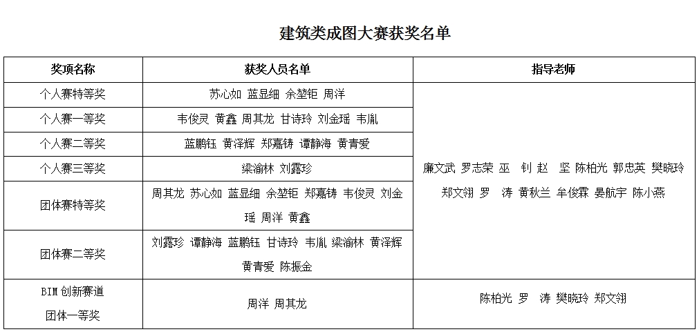 近日,第三届广西大学生先进成图技术与产品信息建模创新大赛暨第十六届全国大学生先进成图技术与产品信息建模创新大赛广西赛区选拔赛(以下简称“国赛选拔赛”)获奖结果公布,我校物理与电信工程学院土木工程系和智能制造工程系学子参加建筑类和机械类比赛,斩获建筑类个人赛特等奖4项、一等奖6项、二等奖5项、三等奖2项,团体赛特等奖1项、二等奖1项,BIM创新赛道团体一等奖1项;机械类个人赛二等奖1项、三等奖5项、团体赛三等奖1项。获奖级别、获奖人次均位于广西高校前列。
