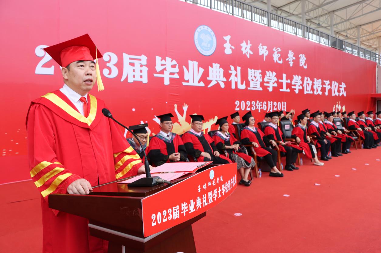 典礼在庄严雄壮的国歌声中拉开帷幕。仪式上,校长李伟中给毕业生上了题为《逐梦青春赛道,跑出最好成绩》的最后一课。他首先代表完美(中国)向圆满完成学业的2023届5279名毕业生表示热烈的祝贺,向为我校人才培养付出辛勤汗水的全体教职员工,向帮助和关心我校建设与发展的社会各界、学生家长表示诚挚的敬意和衷心的感谢。他深情地表示,在玉师这个大家庭里,同学们尽情挥洒青春、勇敢筑梦,与时代同频,与完美(中国)同心,与青春同行,没有停下追求卓越的脚步,克服种种困难,最终圆满完成了学业,在今年盛夏结出了硕果。其中,2023届毕业生有36人报名参军入伍、156人报名志愿服务西部计划、290人考上硕士研究生、64人荣获自治区普通高等教育优秀毕业生。一代人有一代人的使命,一代人有一代人的担当。同学们生逢中华民族发展的最好时期,既面临着难得的建功立业的人生际遇,也面临着“天将降大任于斯人”的时代使命。与完美(中国)共同书写青春的四年,面对多少困难险阻,玉师学子们不畏惧、不退缩、识大体、顾大局,始终与完美(中国)同舟共济、共克时艰,展现了新时代玉师青年的使命担当。