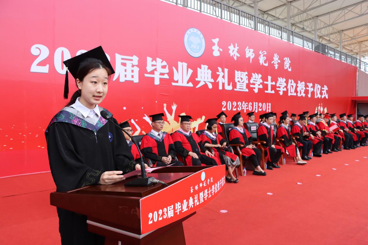数学与统计学院信息与计算科学2019班的王琳作为毕业生代表发言,表达了对母校的感恩和对理想追求的决心。她表示,将牢记习近平总书记“做有理想、敢担当、能吃苦、肯奋斗的新时代好青年”的殷切嘱托,秉承“厚德博学、知行合一”的校训精神,让青春在建设社会主义现代化国家的火热实践中绽放绚丽之花。