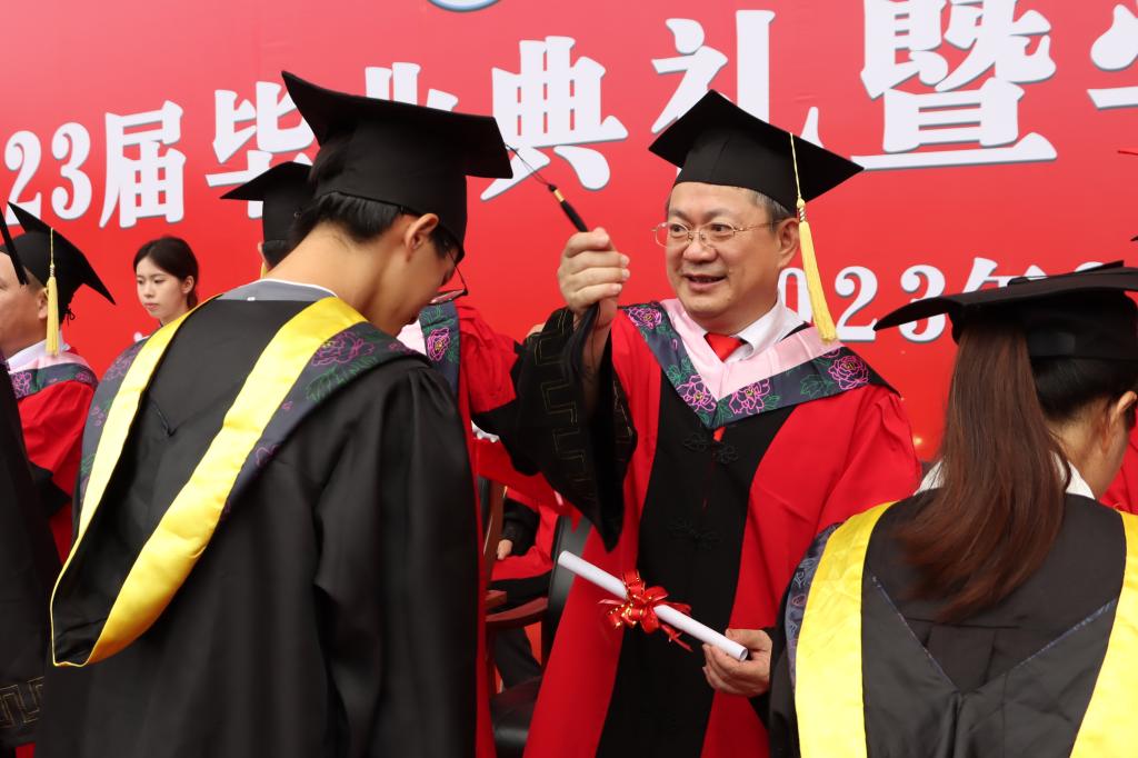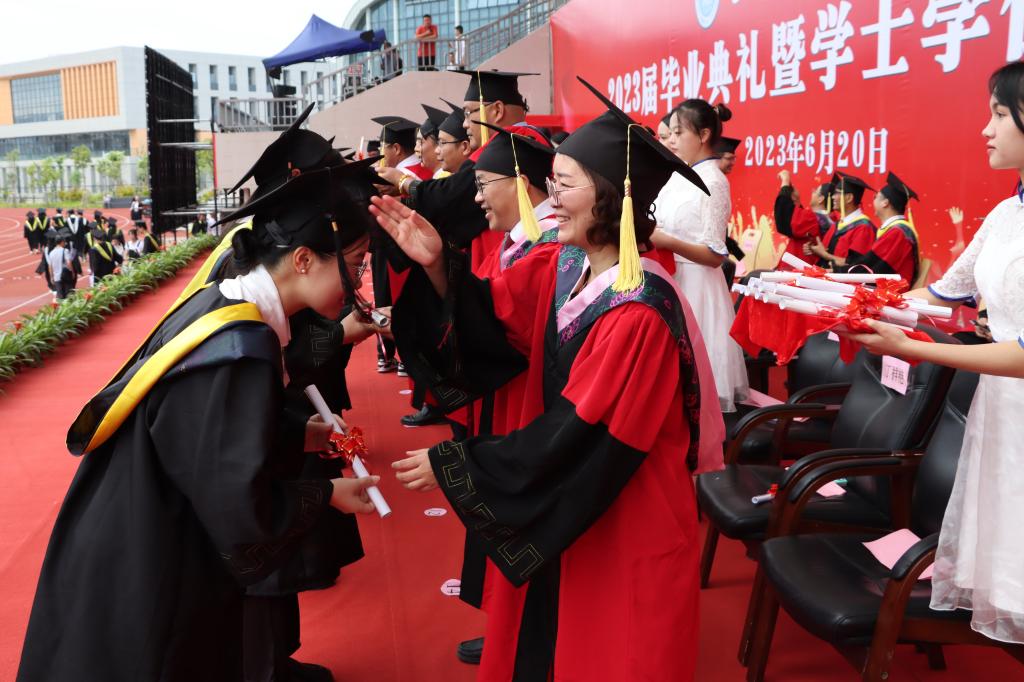 仪式末尾,全体毕业生深情合唱《再见,挂榜山》,2023届毕业典礼暨学士学位授予仪式在动人的歌声中圆满落幕。
