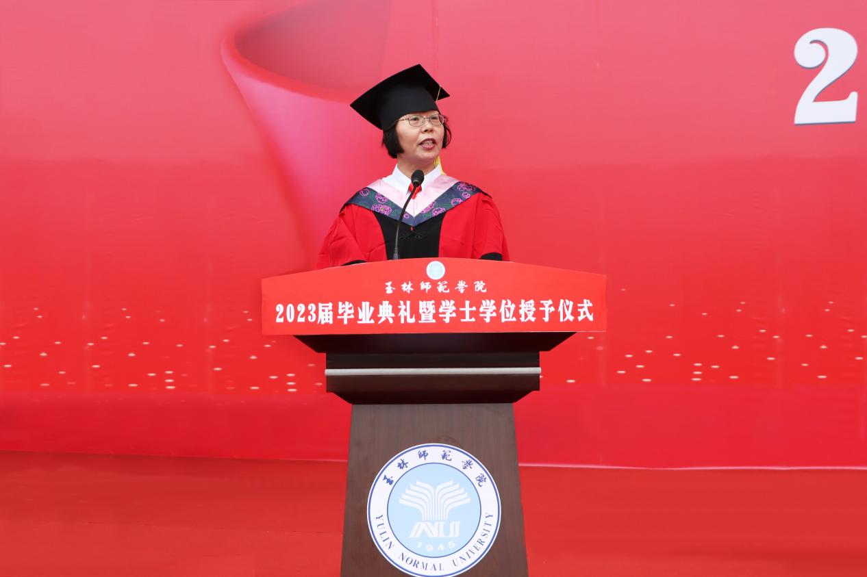外国语学院郎晓娟老师作为教师代表发言,她向2023届毕业生表达了最真挚的祝福与憧憬,希望同学们在现实生活中找寻属于自己的热爱,在未来的岁月里丰满自己的羽翼,勇敢顽强,脚踏实地,带着勇气、知识、信念、追求去创造自己的新生活。