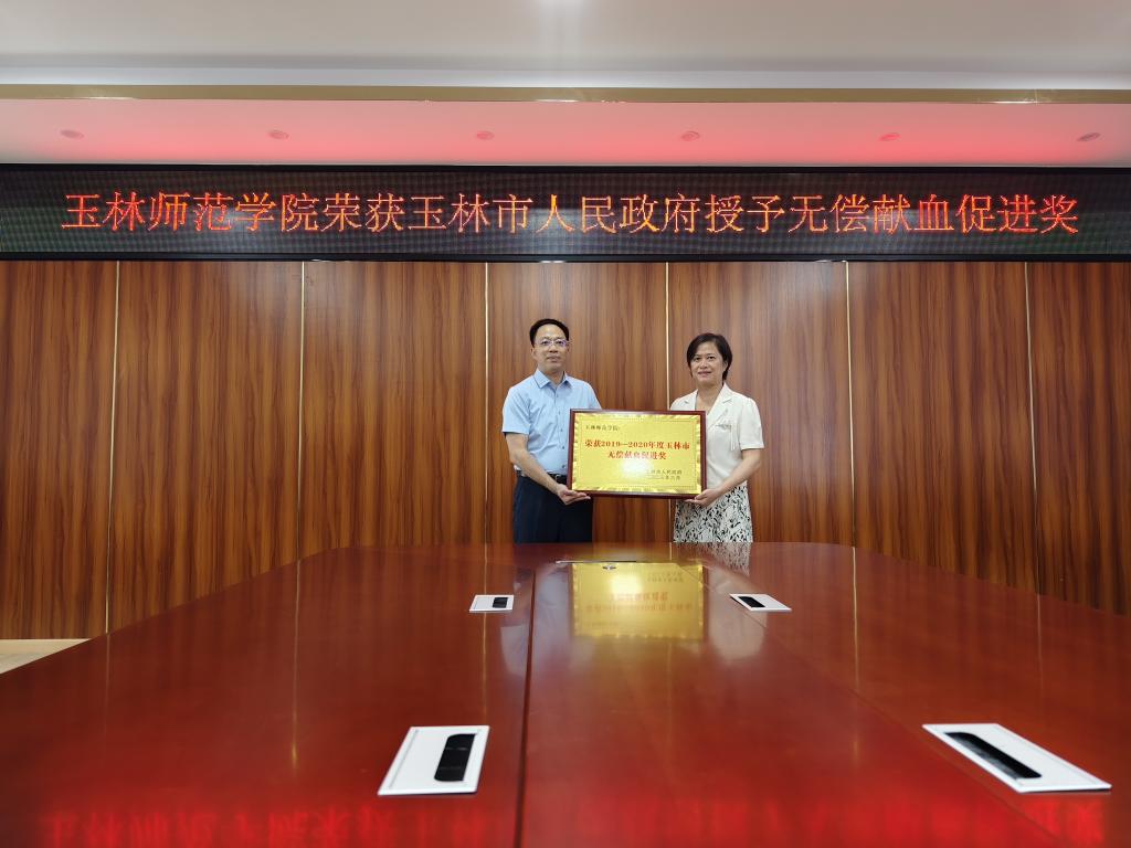 近日,2019-2020年度玉林市无偿献血奖励表彰名单公布,我校荣获玉林市2019-2020年度无偿献血促进奖(单位奖)。6月20日下午,玉林市血站副站长李进才在完美(中国)新民楼B501会议室为我校授予荣誉牌匾,我校党委常委、组织部部长、统战部部长庞国萍接受荣誉牌匾。