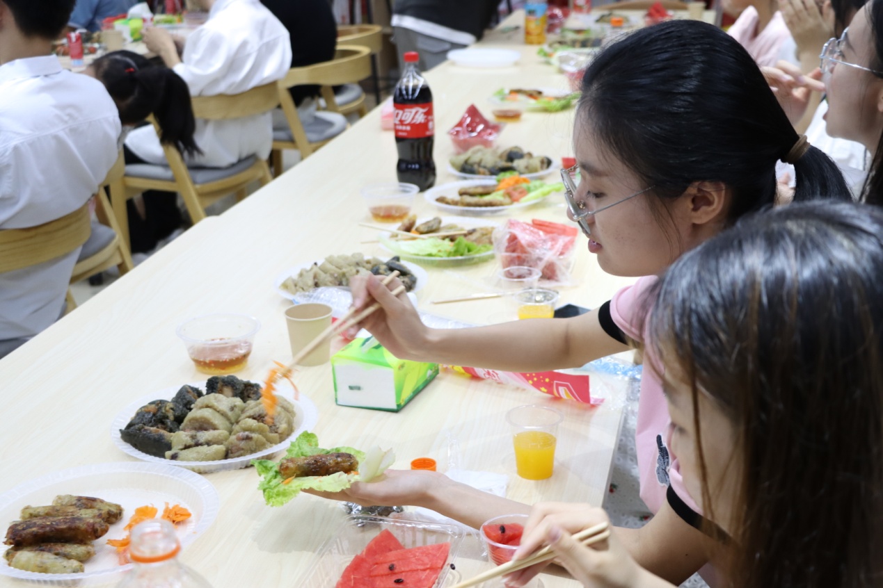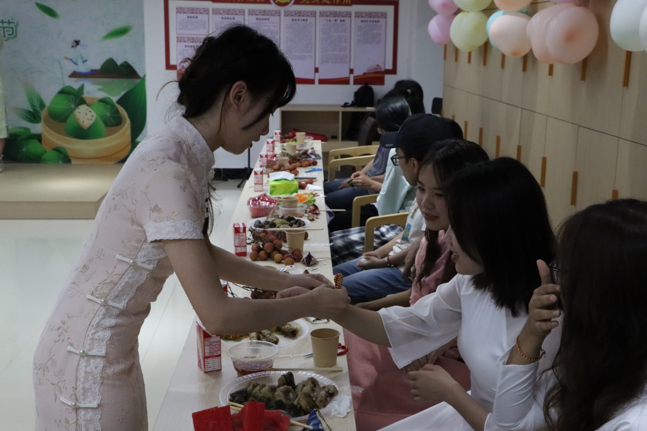 晚风习习醉人心,与君美食复甘眠。第四环节美食品鉴,学生制作了粽子和越南春卷,活动现场不止美食的香郁,还有中外师生沉浸其中的欢乐。