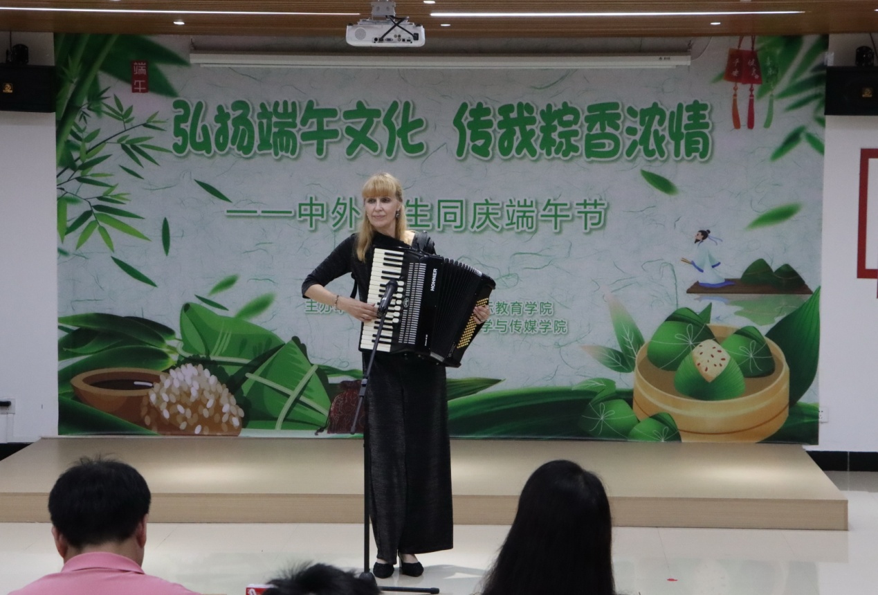 舞势随风散复收,歌声似磬韵还幽。第五环节歌舞表演与服装秀,歌舞升平,共同感受各国服饰的风韵。白俄罗斯外教柳德米拉的手风琴独奏,带领师生感受白俄罗斯风情;文学与传媒学院学生倾情演唱《茉莉花》,在歌声中缓缓起舞,展现中国旗袍与古典舞蹈的柔美,并为在座的师生系上五色绳,表达对师长的美好祝愿;老挝留学生鹏飞吉他弹唱歌曲《回到起点》,留学生身穿泰国传统服饰伴舞,展现多彩异域风情;越南留学生身穿越南特色服饰演唱歌曲《素颜》,用朝气蓬勃的歌声为本次活动画上圆满句号,余音绕梁久未消。