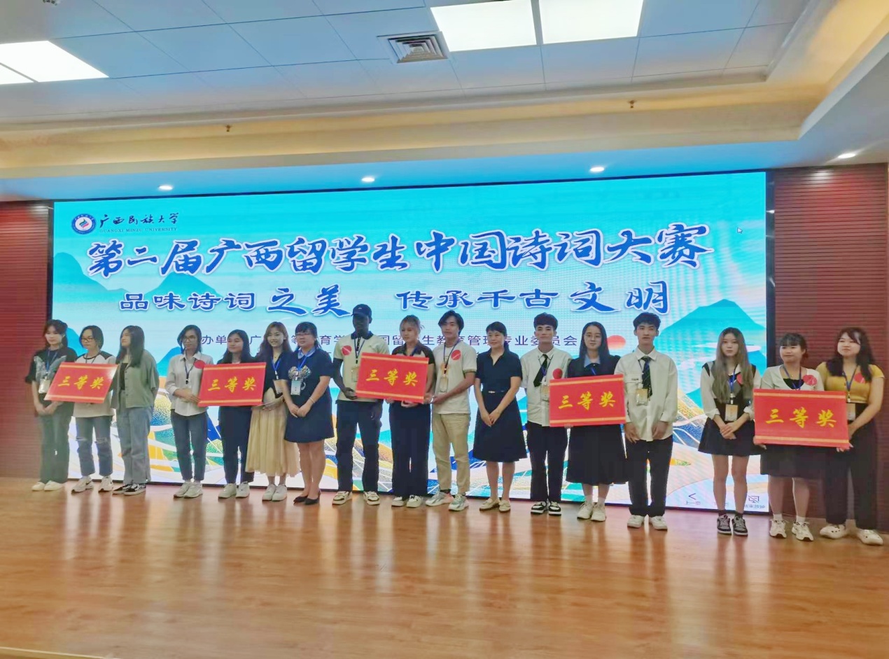 近日,由广西高等教育学会外国留学生教育管理专业委员会主办、广西民族大学国际教育学院承办的第二届广西留学生中国诗词大赛在广西南宁举行。我校国际教育学院越南留学生丁明英、黄氏金舒、杨文得参赛并荣获三等奖。