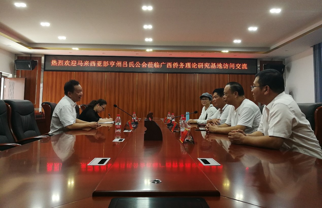 8月7日上午,马来西亚彭亨州吕氏公会主席吕才佳一行莅临广西侨务理论研究基地访问交流,玉林市原侨联主席钟雄、玉林市侨联副主席陈毅南、广西侨务理论研究基地副主任陈碧,我校党委常委、副校长、基地主任石维有出席交流会。