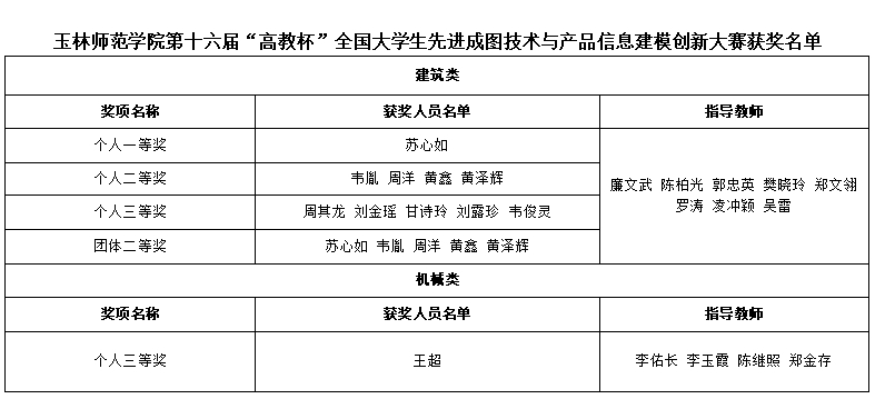 近日,第十六届“高教杯”全国大学生先进成图技术与产品信息建模创新大赛全国总决赛在重庆落下帷幕,我校物理与电信工程学院学子荣获建筑类个人一等奖1项、二等奖4项、三等奖5项,团体二等奖1项;机械类个人三等奖1项。获奖级别、获奖人次均位于广西高校前列。