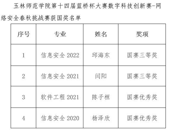 近日,第十四届蓝桥杯大赛数字科技创新赛——网络安全春秋挑战赛全国总决赛获奖名单揭晓,我校代表队荣获第十四届蓝桥杯大赛数字科技创新赛——网络安全春秋挑战赛全国三等奖2项、全国优秀奖2项、广西一等奖5人、广西二等奖3人。校代表队由计算机科学与工程学院学子组成,邱杰老师带队指导。