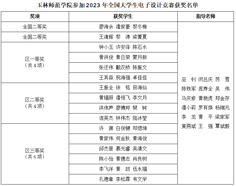 近日,2023年全国大学生电子设计竞赛落下帷幕。我校物理与电信工程学院参赛队伍荣获本次竞赛国家二等奖2项;区级一等奖4项、二等奖4项、三等奖6项(见附表)。