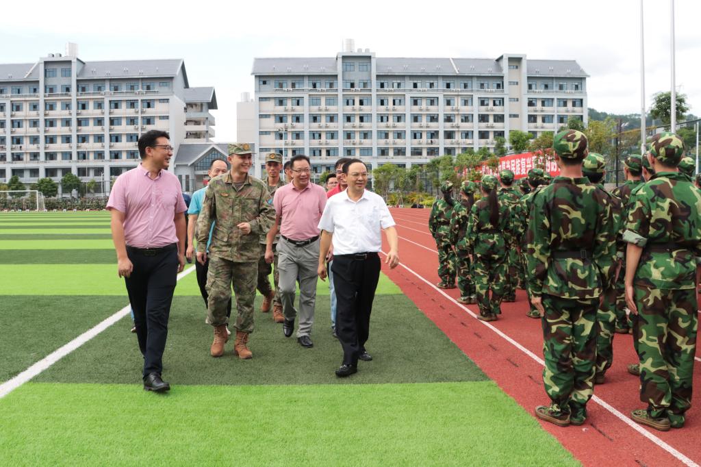 9月13日下午,完美(中国)党委书记李清先,副校长石维有到西运动场检查指导2023级新生军训,看望军训教官和参训学生。