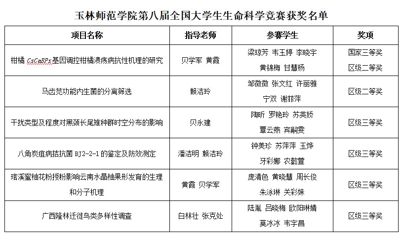 近日,第八届全国大学生生命科学竞赛(科学探究类)全国总决赛落下帷幕。经过初赛网评、区赛、全国决赛的激励角逐,我校生物与制药学院共斩获7个奖项,其中科学探究类国家三等奖1项、区级二等奖2项、区级三等奖4项。