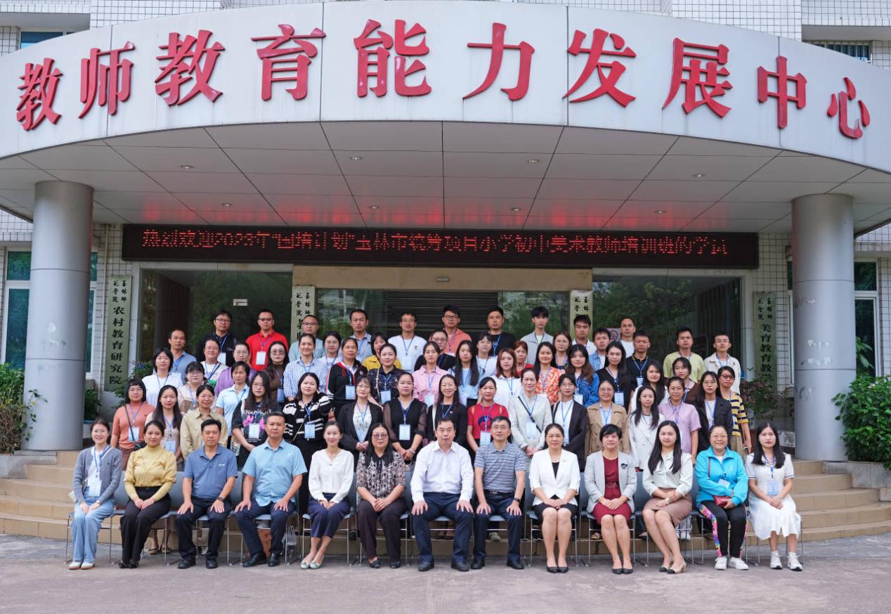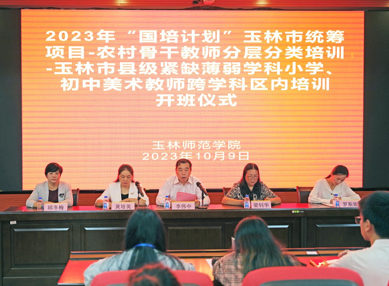 10月9日上午,2023年"国培计划"中西部骨干项目-农村骨干教师分层分类培训-玉林市县级紧缺薄弱学科小学、初中美术教师跨学科区内培训班开班仪式在我校东校区教师教育能力发展中心举行。我校校长李伟中,教师教育学院、玉林市教师培训中心、美术与设计学院负责人出席开班仪式,培训班全体学员参加仪式。