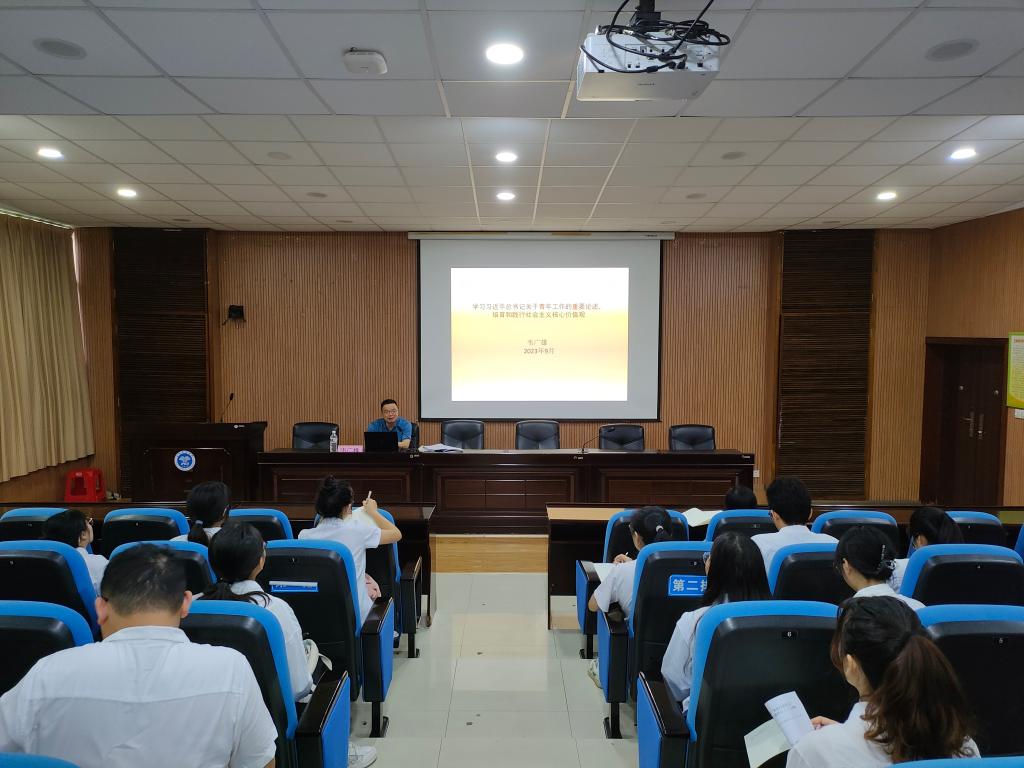 会上,韦广雄为学员们介绍了《论党的青年工作》一书。他分别从“习近平总书记对新时代青年的期待”“社会主义核心价值观浅析”“培育和践行社会主义核心价值观,做新时代优秀青年”三个方面展开讲述,并与学员们现场交流探讨。他提出三点要求,一是读原著,悟原理,以学铸魂、以学增智、以学正风、以学促干;二是加强理论学习,关注时事热点,深学细悟习近平新时代中国特色社会主义思想的理论体系和核心要义;三是努力践行“七个着力”的重大要求,培育和践行社会主义核心价值观。