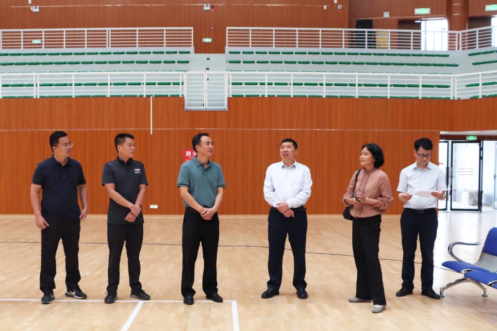 10月16日下午,玉林市副市长党万坚一行到我校新体育馆调研第一届全国学生青年运动会(以下简称“学青会”)筹备工作,党万坚现场听取我校场馆建设工作汇报,一一询问各类设施的配备状况,了解场馆信息化和竞赛信息化的建设情况。党万坚充分肯定了我校在学青会场馆建设方面所做的努力,并对进一步优化体育赛事服务、完善馆内设施提出意见建议。