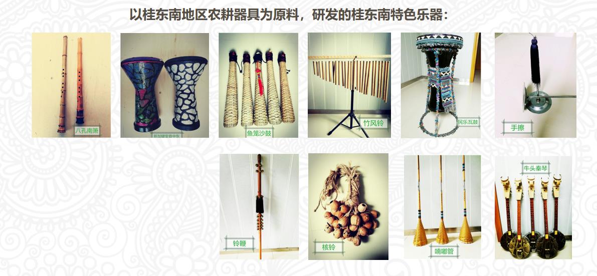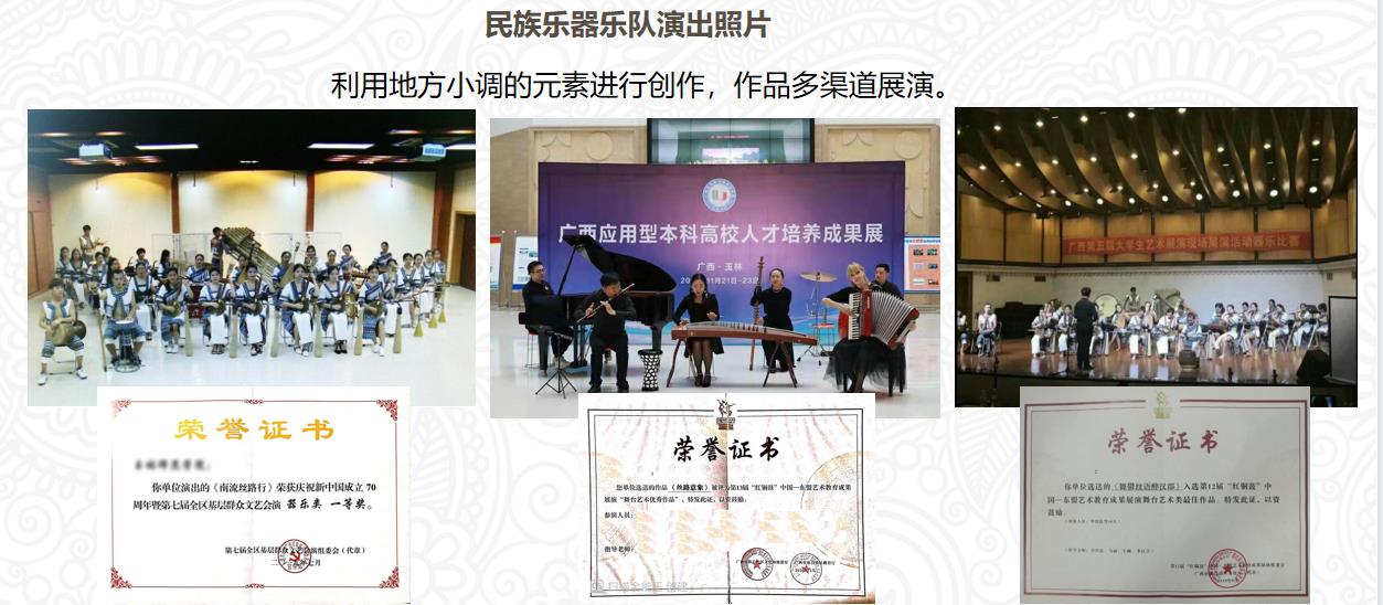 在课程建设的过程中,马丽和她的团队创建了工作坊。他们以桂东南地区农耕器具为原料,研发了一系列具有地域特色的民族乐器;他们利用地方小调的元素进行创作(以原创作品的创作为例),作品多渠道展演,他们参加了“红铜鼓”比赛、大学生艺术展演活动、音乐舞蹈大赛、自治区群众汇演……经过努力,团队获得了大量的省部级奖项,而且有效地提升了本土文化的社会面传播。