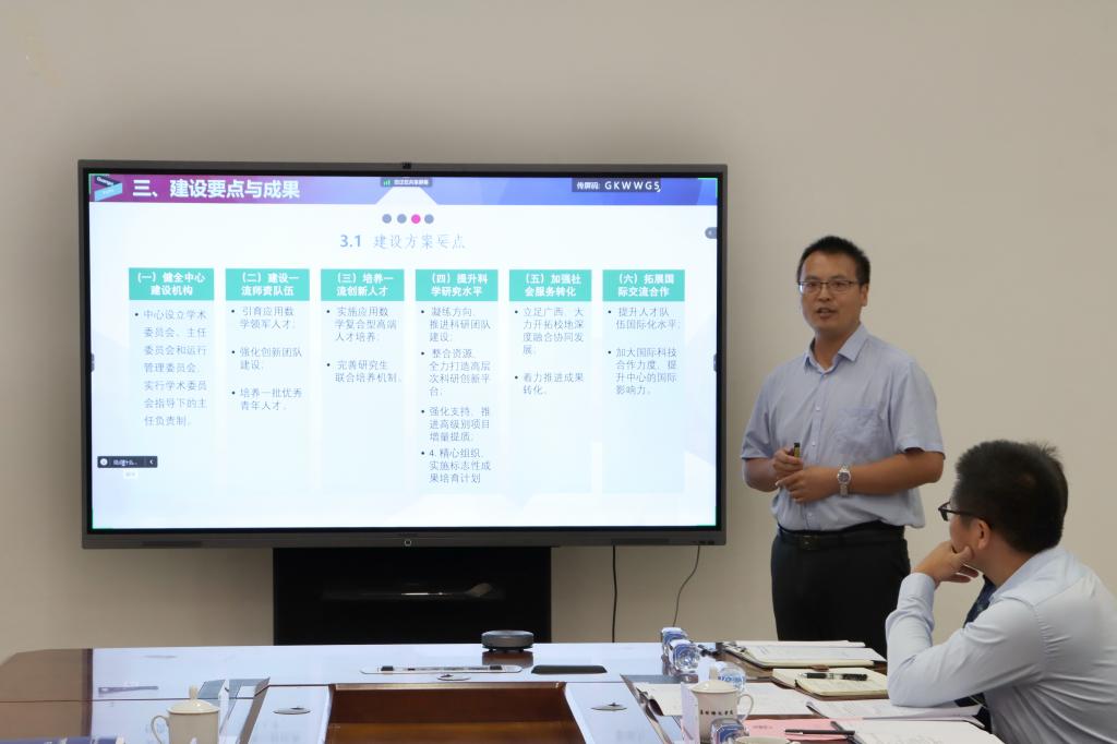 数学与统计学院负责人对广西应用数学中心(玉林师范学院)作建设方案汇报,刘永建对该方案进行说明。学术委员会委员审议建设方案,讨论并形成会议纪要。