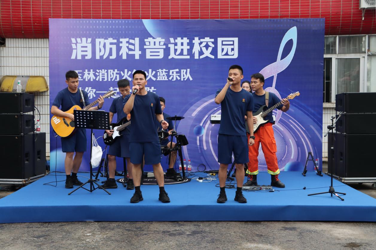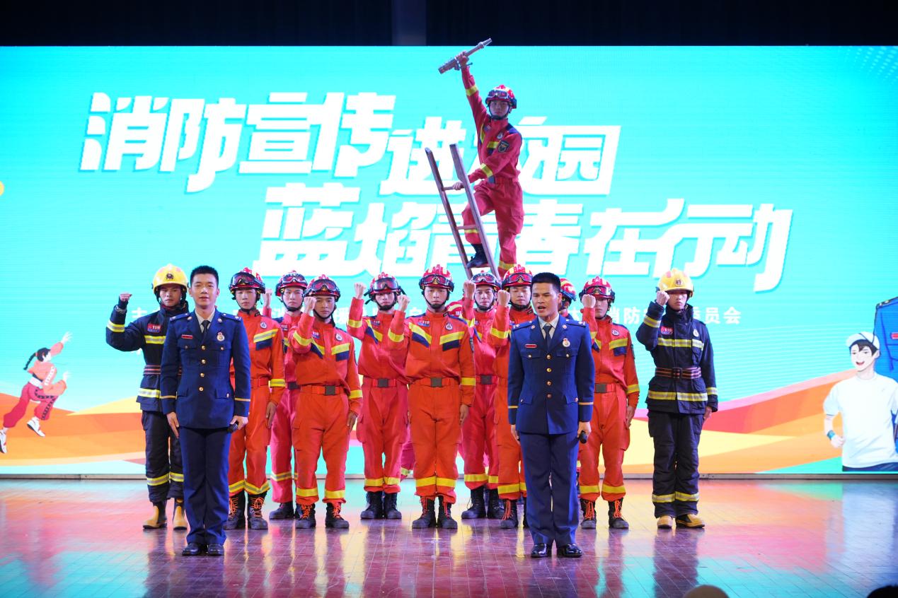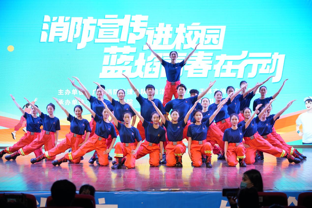 “蓝焰青春在行动”主题宣讲活动以歌舞、乐队表演、功夫操、机甲表演、健美操景剧、演唱、武术、歌伴舞等多种形式向师生群众科普消防知识。玉林消防、北流消防、陆川县消防救援大队,玉林师范学院“蓝焰青春”消防志愿服务队、玉林师范学院志愿消防队、消防科普文艺小分队以及玉林无人机协会等单位(团队)纷纷施展才艺,让观众在精彩节目中沉浸式学习消防技能、提升安全意识。在场领导还为我校相关团队授牌、授旗。