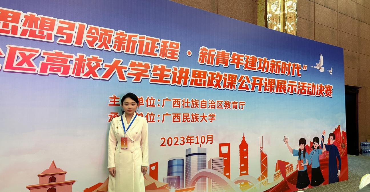 近日,由自治区教育厅主办、广西民族大学承办的“新思想引领新征程·新青年建功新时代” 2023年全区高校大学生讲思政课公开课展示活动决赛在南宁举行。在我校马克思主义学院杨耕老师、周金花老师指导下,2020级财务管理专业徐茜茜同学参赛团队以“贯彻绿色发展理念 描绘壮美广西图景”为题的教学展示活动获得自治区本科院校二等奖,李扩同学的参赛团队以“走进红色人物,不忘初心使命——瞻仰朱锡昂烈士有感”为题的教学展示活动获得三等奖。此外,在全区高校大学生“我心中的思政课”微电影作品展示活动中,陈红曼老师所指导的郑美宁同学参赛团队以题为“你好,新时代”的微电影作品,伍春容老师指导的覃梦瑶同学参赛团队以题为“探寻理想”的微电影作品获得本科院校组三等奖。