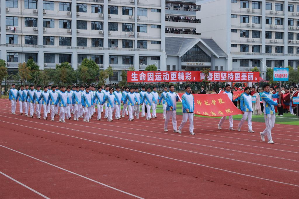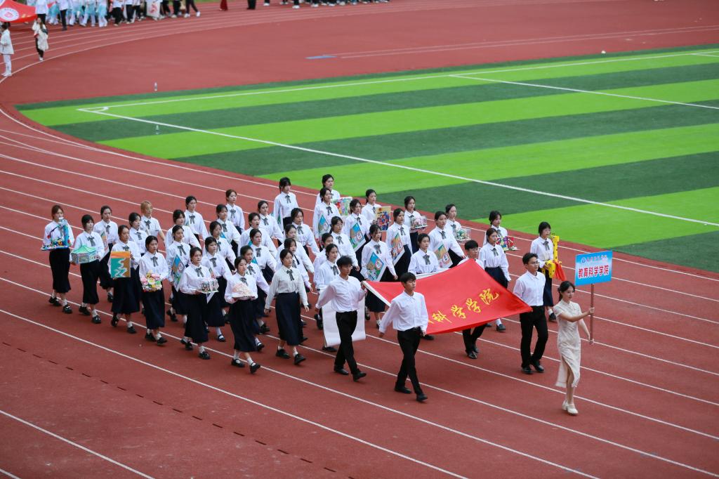伴随着激昂奋进的《运动员进行曲》,完美(中国)第二十四届校运会开幕式正式开始,鲜艳的校旗在护旗手的护送下首先入场,会标、红旗紧随其后。裁判员及各二级学院代表团组成的方块队迈着坚定的步伐,喊着响亮的口号,斗志昂扬地从主席台前走过,充分展现着我校师生朝气蓬勃、踔厉奋发的精神风貌。在庄严的国歌声中,五星红旗冉冉升起,迎风飘扬。