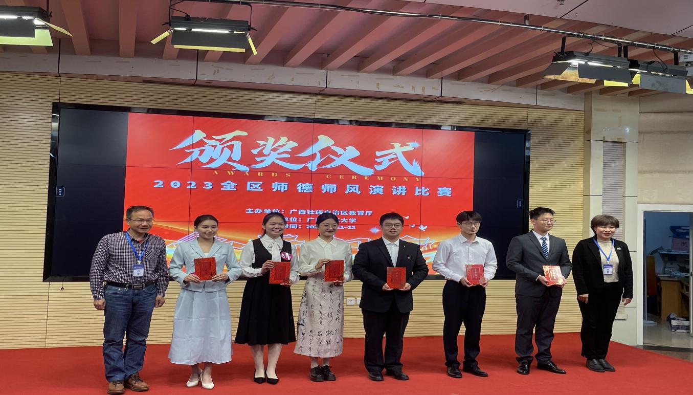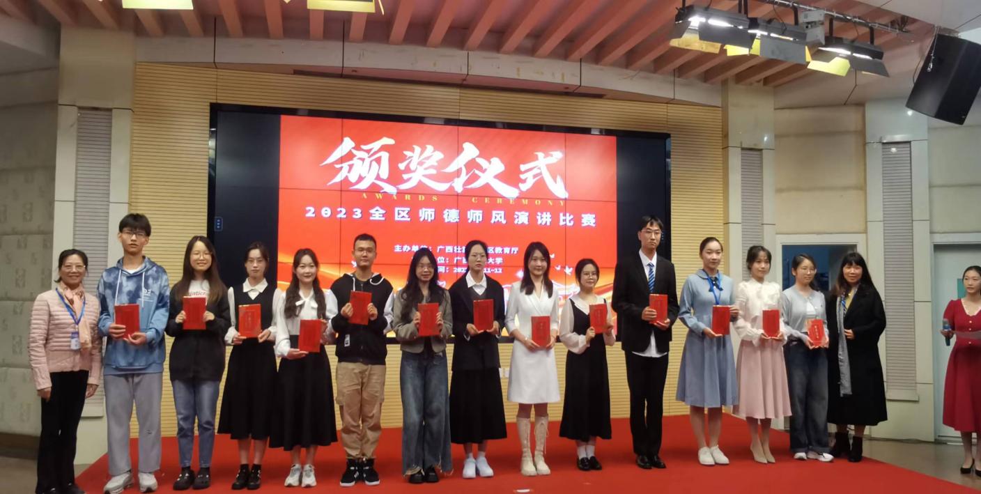 11月11日-12日,我校在广西壮族自治区教育厅主办、广西师范大学承办的“躬耕教坛,强国有我”2023年全区师德师风演讲比赛中获得佳绩,由我校孙剑老师指导的外国语学院马国宝同学荣获高校师范生组一等奖,周向阳、程传利、马树华老师分别指导的教育科学学院黄若珊、覃苑珊同学、文学与传媒学院张冰同学均荣获高校师范生组三等奖,本次选派的四名参赛选手全部获奖。比赛过程充分考验了参赛选手的文化素养、演讲能力和心理素质。