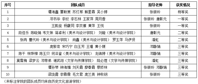 大赛由广西壮族自治区教育厅主办,广西文化和旅游策划规划设计协会、桂林理工大学旅游与风景园林学院、广西本科高校旅游管理教学指导委员会等单位联合承办,来自广西区内25所大专院校200余支团队报名参赛,学生涵盖高职、本科、研究生等层次,赛期长达5个月,即6月-11月。大赛分为文化旅游目的地创新设计、文创产品设计、数字文旅产品创新设计、文化旅游营销策划(视频)四个组别,全方位为广西文化旅游产业发展贡献智力。经过初赛和复赛,我校荣获文化旅游目的地创新设计组特等奖1项、文创产品设计组一等奖1项和二等奖2项、数字文旅产品创新设计一等奖1项,获得与会专家的高度肯定和表扬。此外,我校在初赛阶段获得三等奖5项,获奖作品共10项。