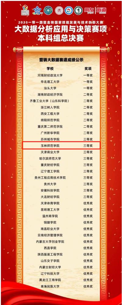 11月26日,2023一带一路暨金砖国家技能发展与技术创新大赛大数据分析应用与决策赛项总决赛成功落幕。经过激烈角逐,我校商学院团队在2023一带一路暨金砖国家技能发展与技术创新大赛大数据分析应用与决策赛项本科组总决赛营销大数据赛道荣获三等奖佳绩。