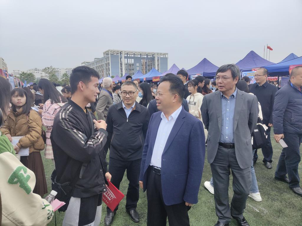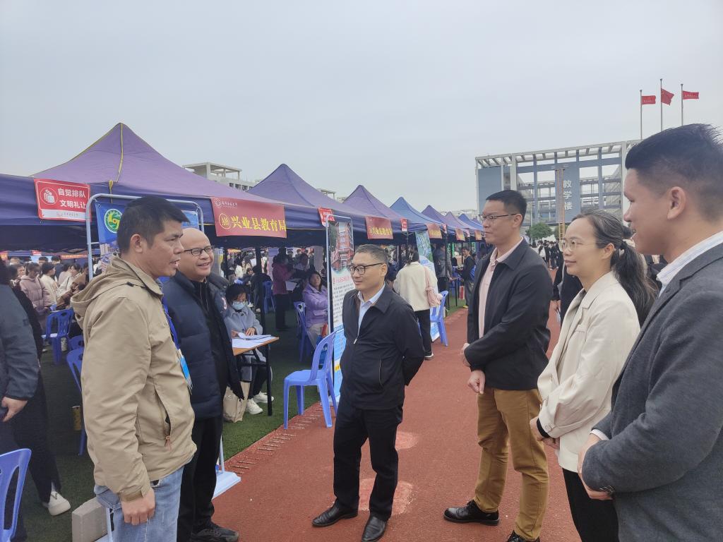 在双选会上,自治区教育厅副厅长伍锦昌到场指导。他向刘永建详细了解了我校2024届师范类毕业生的就业工作情况以及本次学生参会情况,对我校统一组织2024届家庭经济困难毕业生赴南宁参加双选会的精准帮扶做法给予了充分肯定。