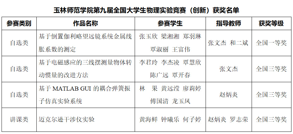 11月26日,第九届全国大学生物理实验竞赛(创新)决赛在重庆大学落下帷幕。我校物理与电信工程学院学生参加本次大赛,并获得全国一等奖1项、三等奖3项,实现了我校此赛事全国一等奖的突破。我校获优秀组织奖。