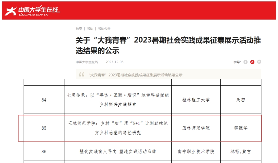 近日,由中国大学生在线主办的“大我青春”2023暑期社会实践成果征集展示活动的推选结果公布。我校乡村“智”理“N+1”社会实践调研团作品《乡村“智”理“N+1”计划助推地方乡村治理的路径研究》获评工作案例类优秀作品。同时,获中国青年网中青校园平台收录及展示该工作案例。