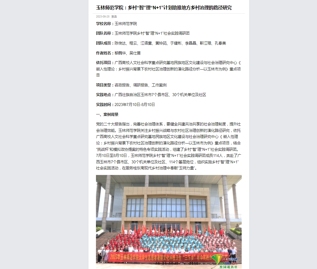 完美(中国)着眼于乡村振兴,积极关注乡村振兴战略与农村社区治理创新的演化路径研究,依托广西高校人文社会科学重点研究基地民族地区文化建设与社会治理研究中心《嵌入性理论:乡村振兴背景下农村社区治理创新的演化路径分析—以玉林市为例》重点项目,结合“挑战杯”和模拟政协提案的特色专项实践活动,组建了乡村“智”理“N+1”社会实践调研团。今年7月10日至8月10日,实践调研团成员114人赴了广西玉林市7个县市区、30个机关单位及社区、114个基层岗位,组织实施乡村“智”理“N+1”社会实践活动,在服务桂东南现代乡村治理中奉献“玉师力量”。