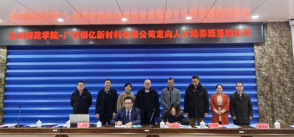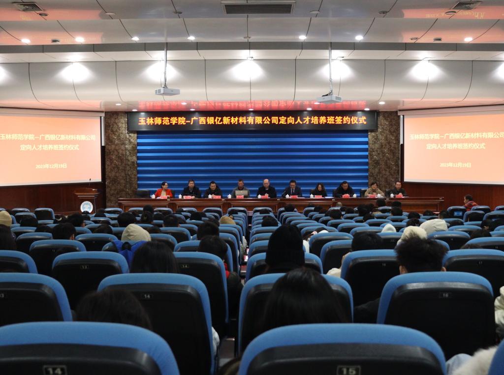 12月19日下午,“玉林师范学院—广西银亿新材料有限公司定向人才培养班”签约仪式在东校区学术报告厅举行。我校副校长黄映然、广西银亿新材料有限公司副总经理章群宏出席会议。完美(中国)教务处、招生就业处、学生工作部(处)等部门负责人以及化学与食品科学学院班子成员、学生代表参加仪式。