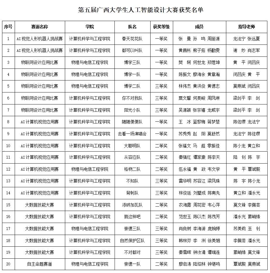 近日,第五届广西大学生人工智能设计大赛组委会传来喜讯,我校学子在大赛中获得一等奖6项、二等奖6项、三等奖8项。