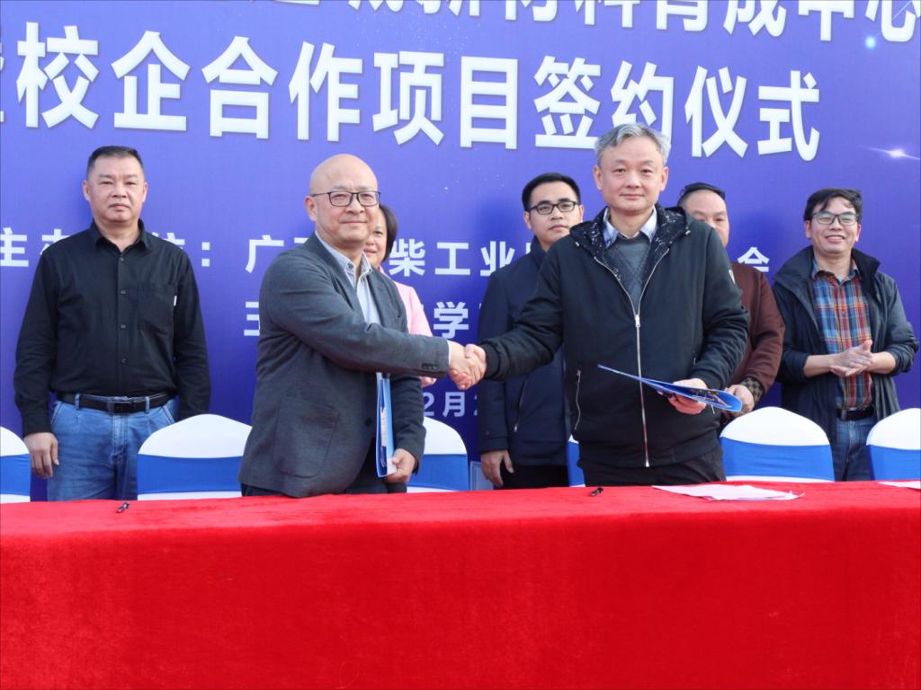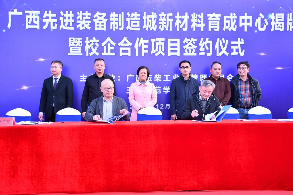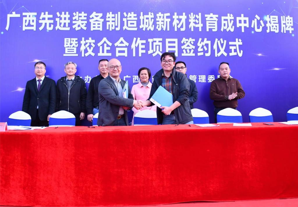 12月28日,我校在玉柴工业园举行广西先进装备制造城新材料育成中心揭牌暨校企合作项目签约仪式。我校党委常委、副校长庞国萍,广西玉柴工业园管理委员会主任邓承梁、副主任李宏,广州众富技术有限公司总经理罗峰,广西海特金属科技有限公司总经理钟坤林,以及二级学院相关负责人、部分师生参加签约仪式。