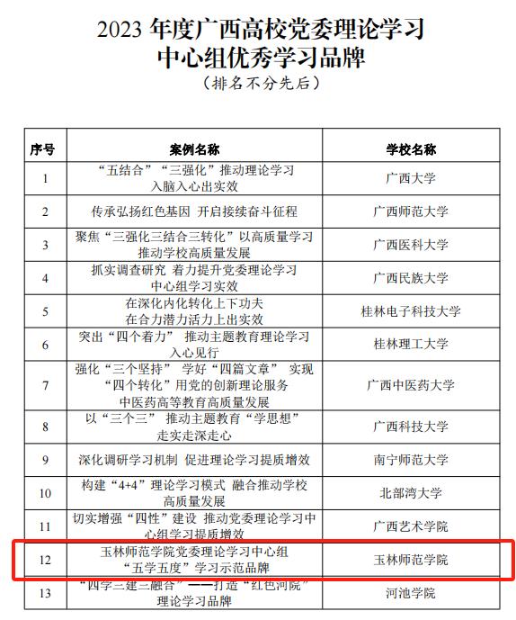 近日,根据《自治区党委教育工委办公室关于公布2023年度广西高校党委理论学习中心组优秀学习品牌和优秀理论(调研)文章的通知》(桂教工委办〔2023〕185号),我校党委理论学习中心组“五学五度”学习示范品牌获评为2023 年度广西高校党委理论学习中心组优秀学习品牌,学校党委副书记韦广雄的文章《着力建设具有强大凝聚力和引领力的社会主义意识形态》入选 2023 年度广西高校党委理论学习中心组优秀理论(调研)文章。