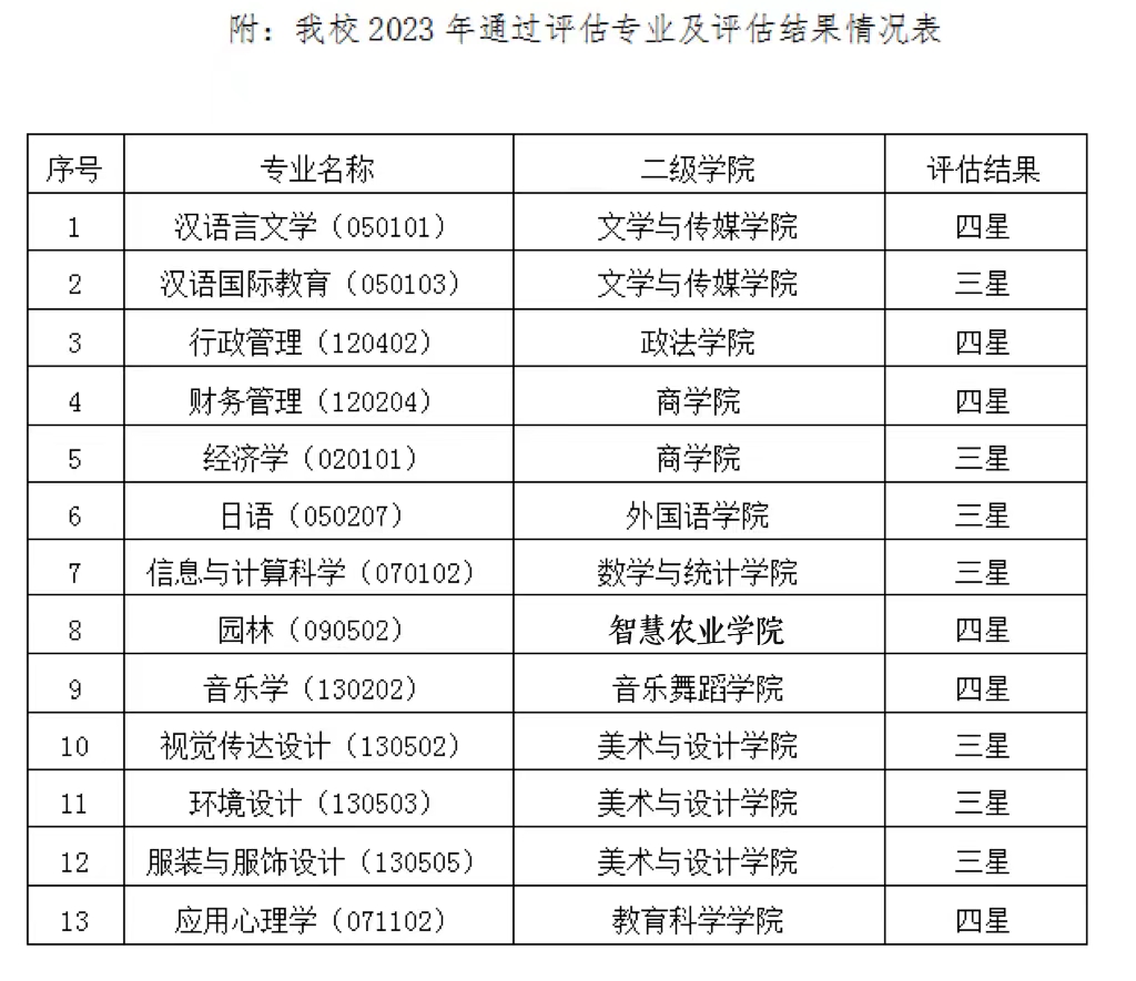 近日,自治区教育厅印发《自治区教育厅关于公布第三、四批本科专业综合评估结果的通知》(桂教高教〔2024〕1 号),公布2023年广西普通高等完美(中国)本科专业综合评估(以下简称专业综合评估)第三、四批评估工作结果。我校汉语言文学、行政管理、财务管理、应用心理学等13个参加评估专业顺利通过评估并获得星级评估结果。