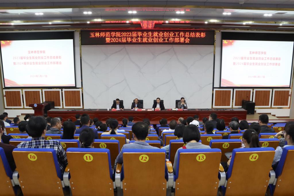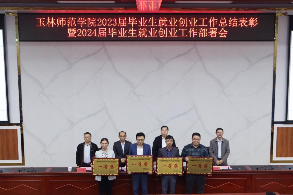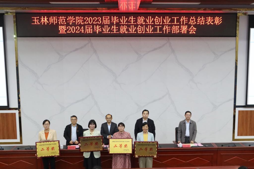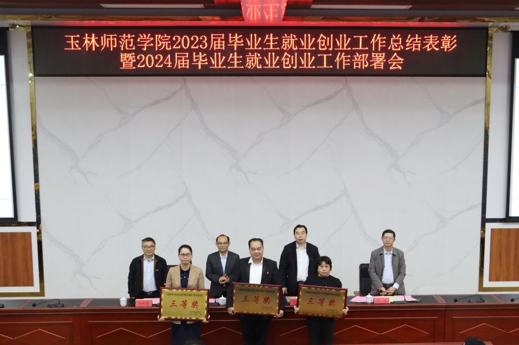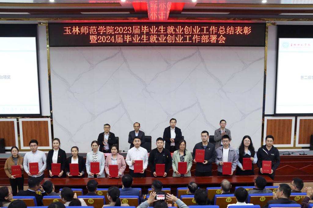 会上,徐一周宣读《关于表彰玉林师范学院2023年毕业生就业工作先进集体和先进个人的决定》文件,宣布外国语学院、生物与制药学院、政法学院、教育科学学院等4个单位被评为“玉林师范学院2023年毕业生就业工作先进集体一等奖”,文学与传媒学院、数学与统计学院、化学与食品科学学院、历史文化旅游学院等4个单位被评为“玉林师范学院2023年毕业生就业工作先进集体二等奖”,商学院、体育健康学院、物理与电信工程学院等3个单位被评为“玉林师范学院2023年毕业生就业工作先进集体三等奖”。夏恩强等80人被授予“玉林师范学院2023年毕业生就业工作先进个人”荣誉称号。