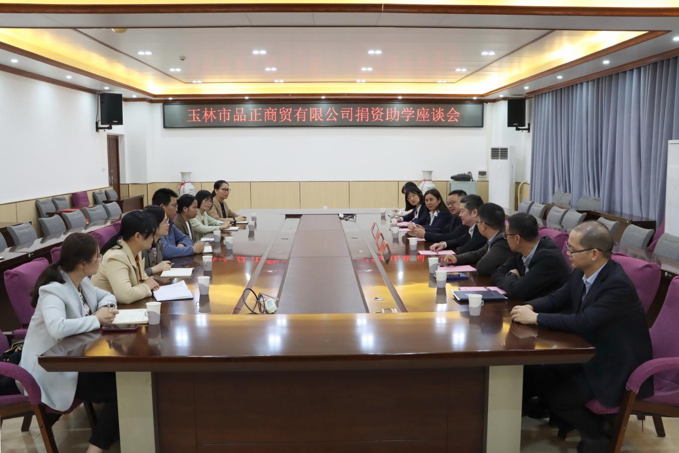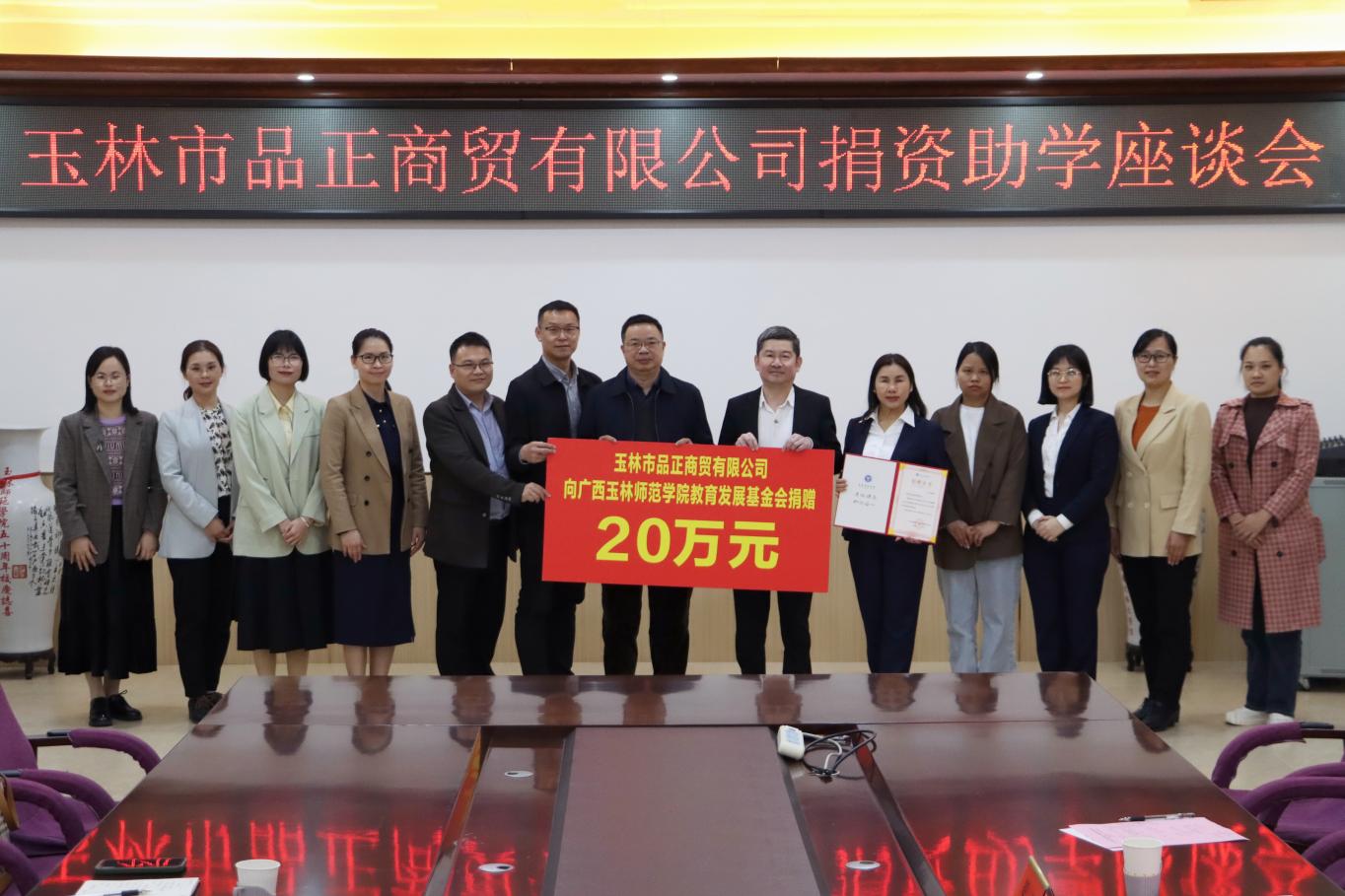 据悉,玉林市品正商贸有限公司向我校教育发展基金会捐赠基金共200万元,分10年资助我校学生。