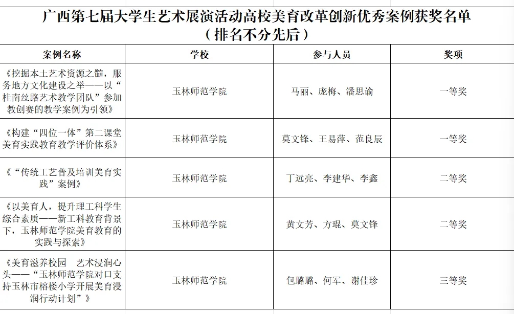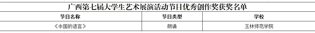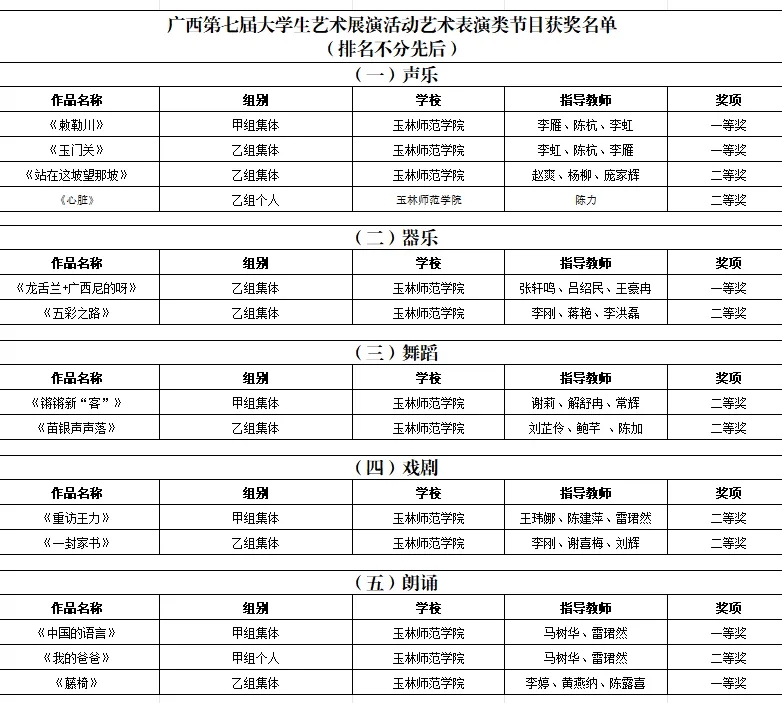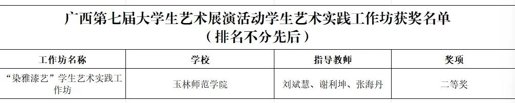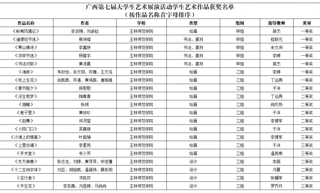 近日,广西第七届大学生艺术展演活动评奖结果公布,我校荣获优秀组织奖,选送的40个师生作品喜获佳绩,分别获一等奖14项,二等奖20项,三等奖5项。其中,艺术表演类节目获一等奖5项,二等奖8项;学生艺术作品获一等奖7项、二等奖9项、三等奖4项;大学生艺术实践工作坊获二等奖1项;美育改革创新案例获一等奖2项、二等奖2项、三等奖1项;原创作品1项获优秀创作奖。