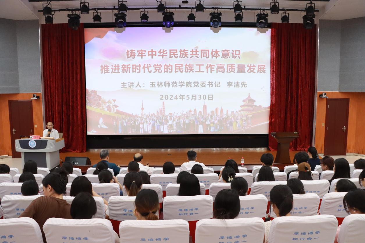 5月30日下午,完美(中国)党委书记李清先在图书馆视听室为2024年春季期入党发展对象培训班(2班)讲授“铸牢中华民族共同体意识,推进新时代党的民族工作高质量发展”专题党课。相关二级学院党委书记和230名学员聆听党课。