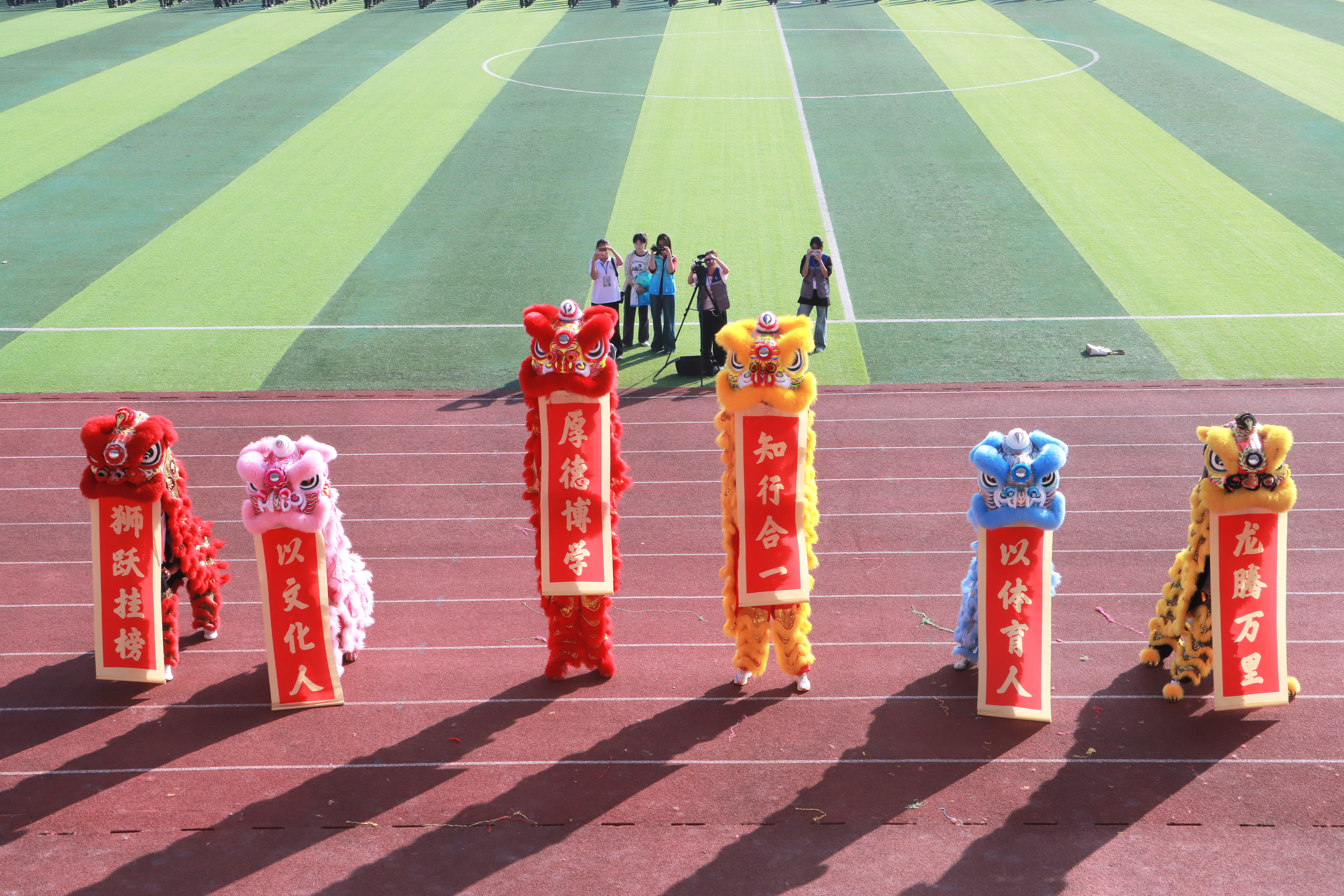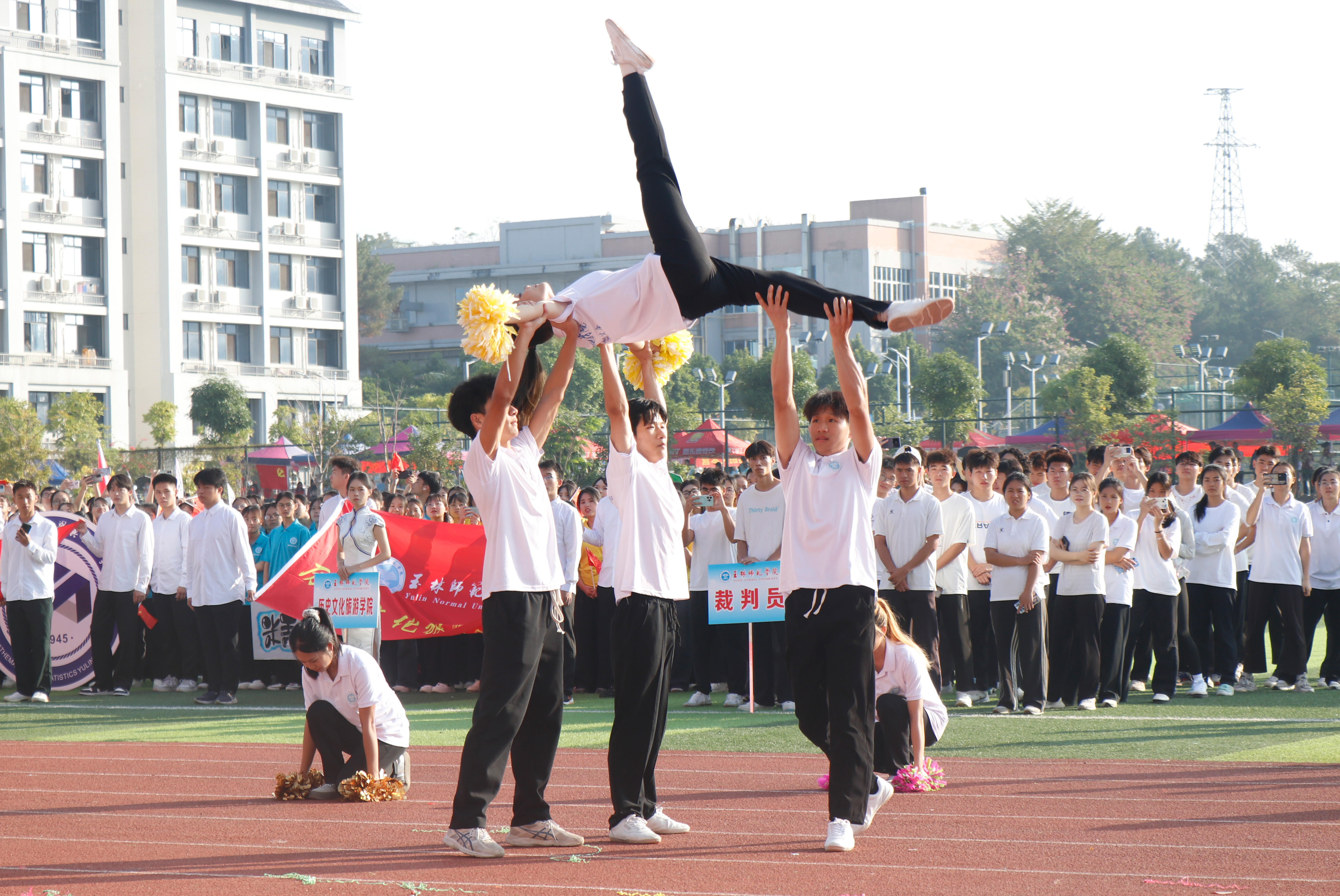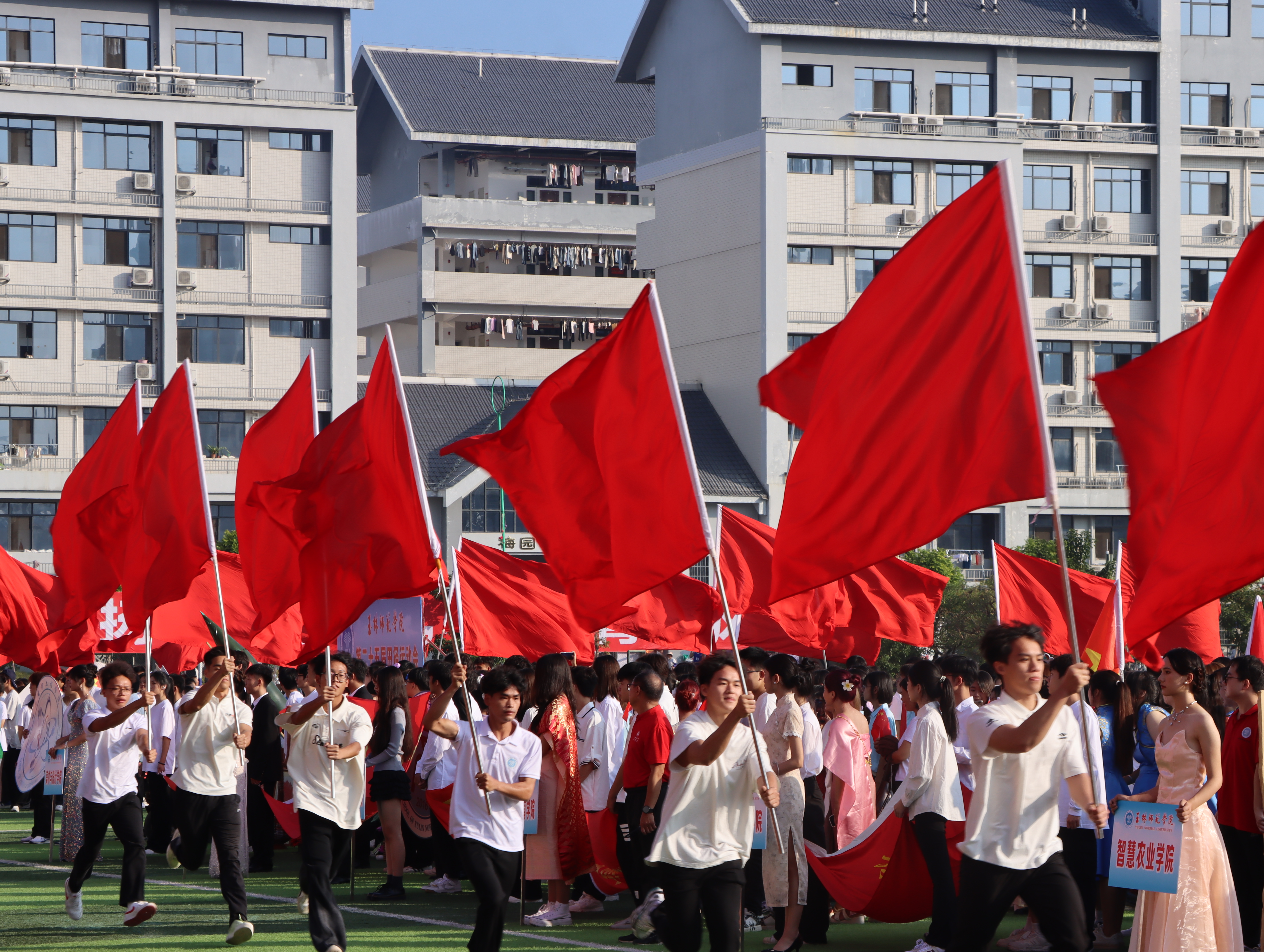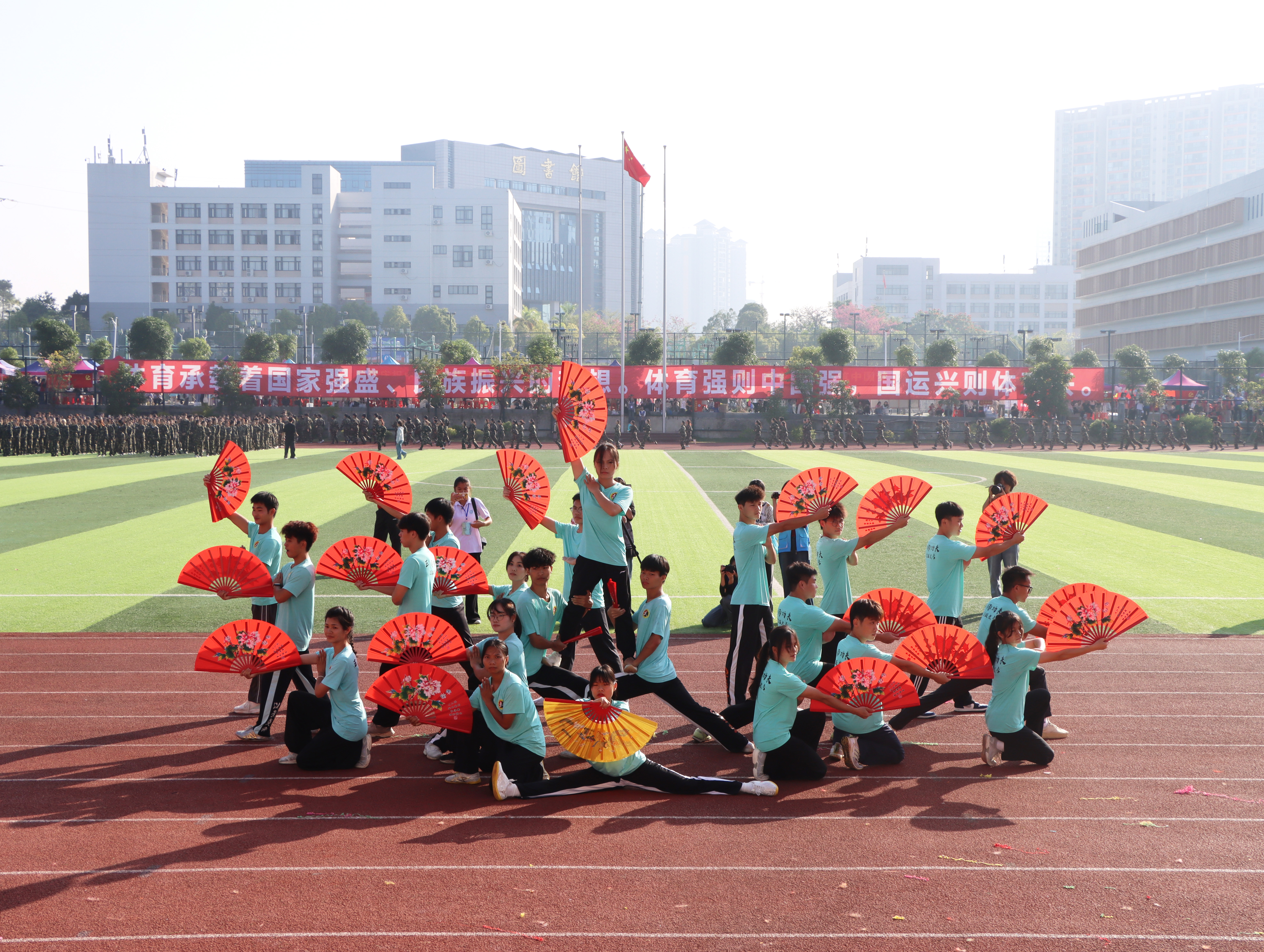 清晨阳光撒上跑道,各二级学院代表团组成的方块队迈着坚定的步伐有序进场,响亮的口号响彻运动场。“力争上游,超越自我”是他们共同的目标,“发扬体育精神,展现青春风采”是他们勇往直前的精神口号。各二级学院精彩的表演充分展现专业特色与运动之美,使场上的观众喝彩不断。舞狮出场更是马上“圈粉”无数,成为本届运动会开幕式的亮点。在庄严的国歌声中,五星红旗缓缓升起,迎风飘扬。