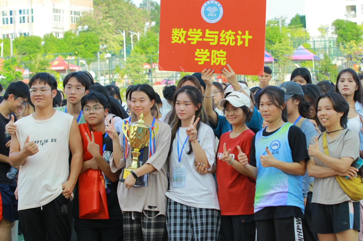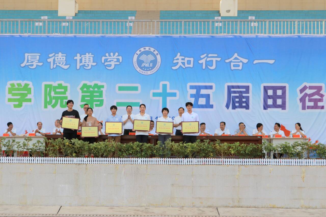 闭幕式宣布了本届运动会获奖名单。本届运动会共有1616人次参加,65人次获得冠军。政法学院在教工组团体总分评比中排名第一,物理与电信工程学院、美术与设计学院分别排名第二、第三。在学生甲组团体总分评比中,数学与统计学院、物理与电信工程学院、计算机科学与工程学院分别位列前三。在学生乙组团体总分评比中,体育健康学院体育教育2024级排名第一,体育教育2023级排名第二,体育教育2022级排名第三。此外,体育健康学院、数学与统计学院等2个学院获得本届田径运动会优秀组织奖,教育科学学院、物理与电信工程学院、文学与传媒学院、智慧农业学院等4个学院获得本届田径运动会体育道德风尚奖。