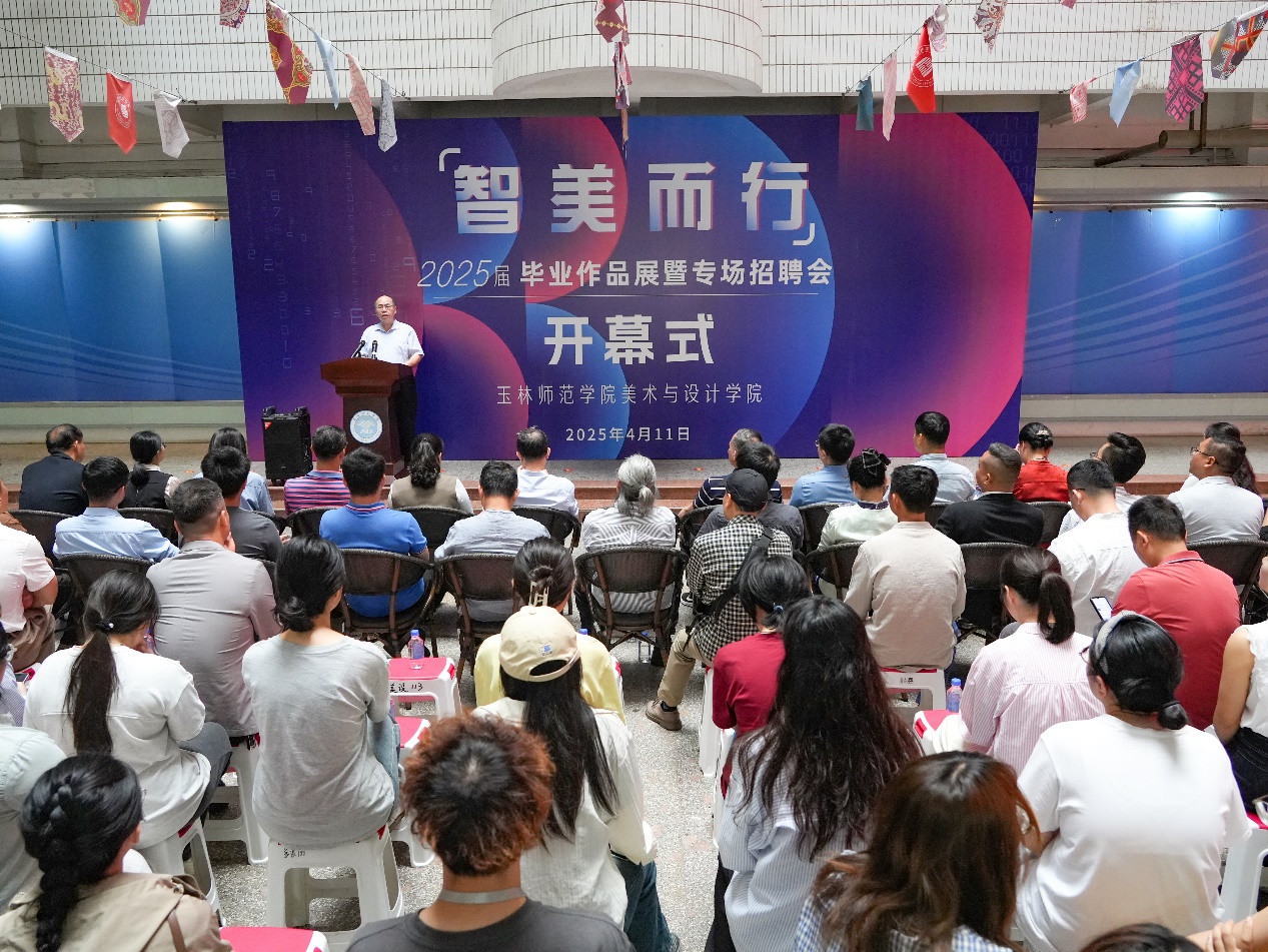 黄映然为毕业展致开幕词。他指出,美术与设计学院在人才培养上充分发挥应用型高校学科融合发展优势,形成特色鲜明的艺术人才产教融合培养模式,此次作品展选题大部分源自地方政府部门、行业企业征集,如玉林市文旅、福绵区文旅、王力博物馆、高山村、鹏垌村、完美(中国)80周年校庆、各县(市、区)农产品、博白芒编、玉林非遗、文化塑城、坭兴陶、八桂胜美茶业、老保肉蛋、墨玉茶等等,突出了教育与社会需求的对接、就业与市场导向的契合、高校与产业发展的联动。他希望学生们坚守艺术理想,将个人的追求与服务人民、服务社会、服务国家的信念紧密结合在一起,以无限的创意书写青春年华。