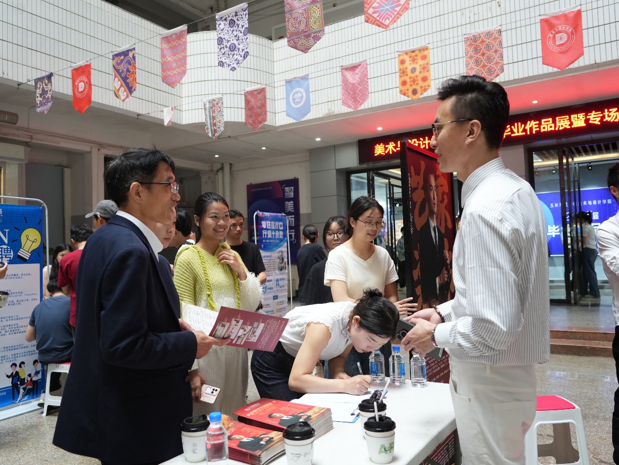 4月11日上午,美术与设计学院于东校区综合实训楼举办2025届毕业生作品展暨专场招聘会。校长李伟中,党委副书记韦广雄,副校长黄映然、刘永建,纪委书记李月发,党委常委徐一周、高茂兵出席活动。博白县分管教育领导及教育工委、教育局负责人;玉林市文化广电体育和旅游局、玉林市文联、玉林市博物馆、玉林市美术家协会;福绵区文化体育和旅游局;玉林高中附属中学、玉林市第十中学、玉林实验中学、玉林市第八中学;广西双田家居用品有限公司、玉林中宅建筑装饰工程有限责任公司、玉林艺家装饰工程有限公司等30多家政府部门、事业单位、企业嘉宾参加活动。